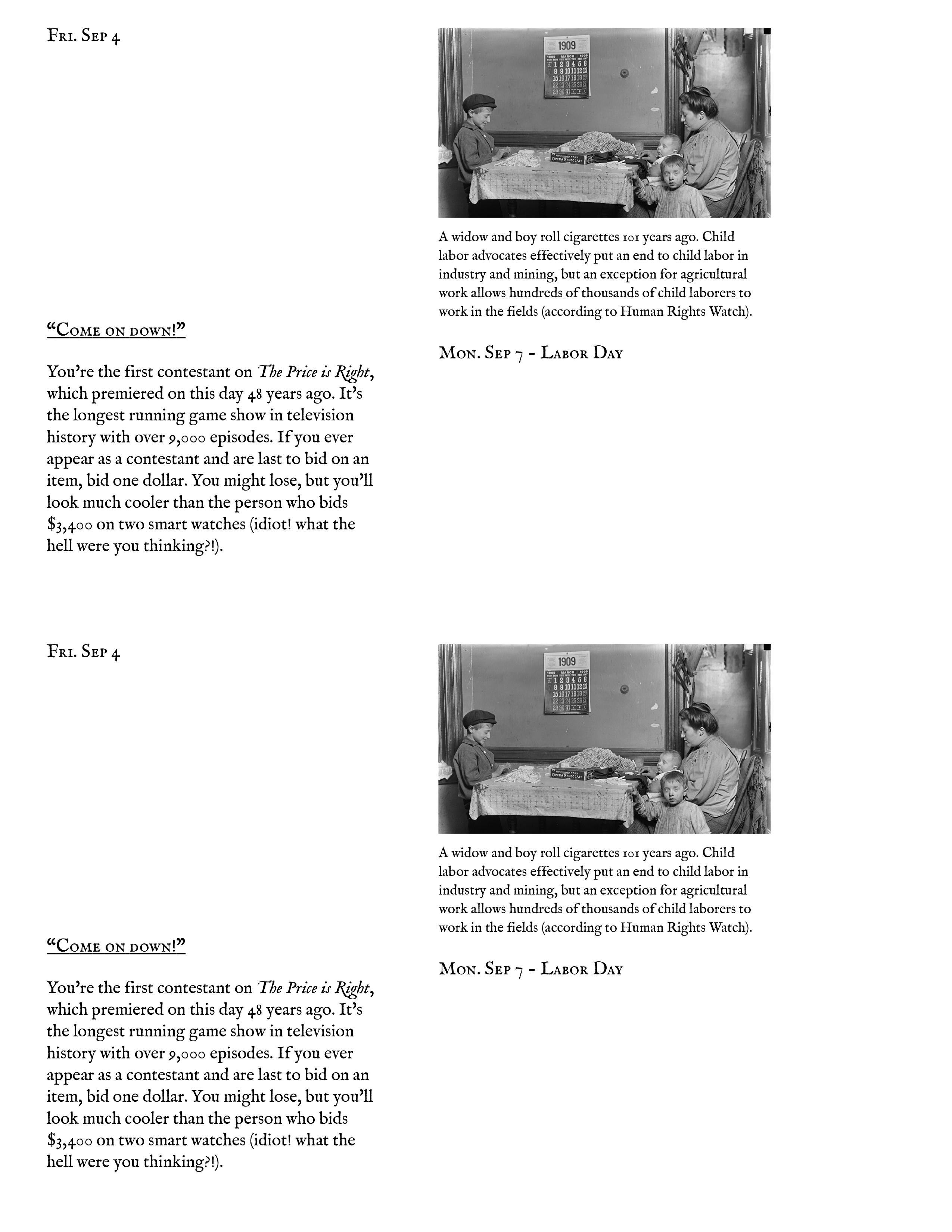 Pages from an almanac I authored and designed: 260 pages, double-sided, spiral bound, 2-up.