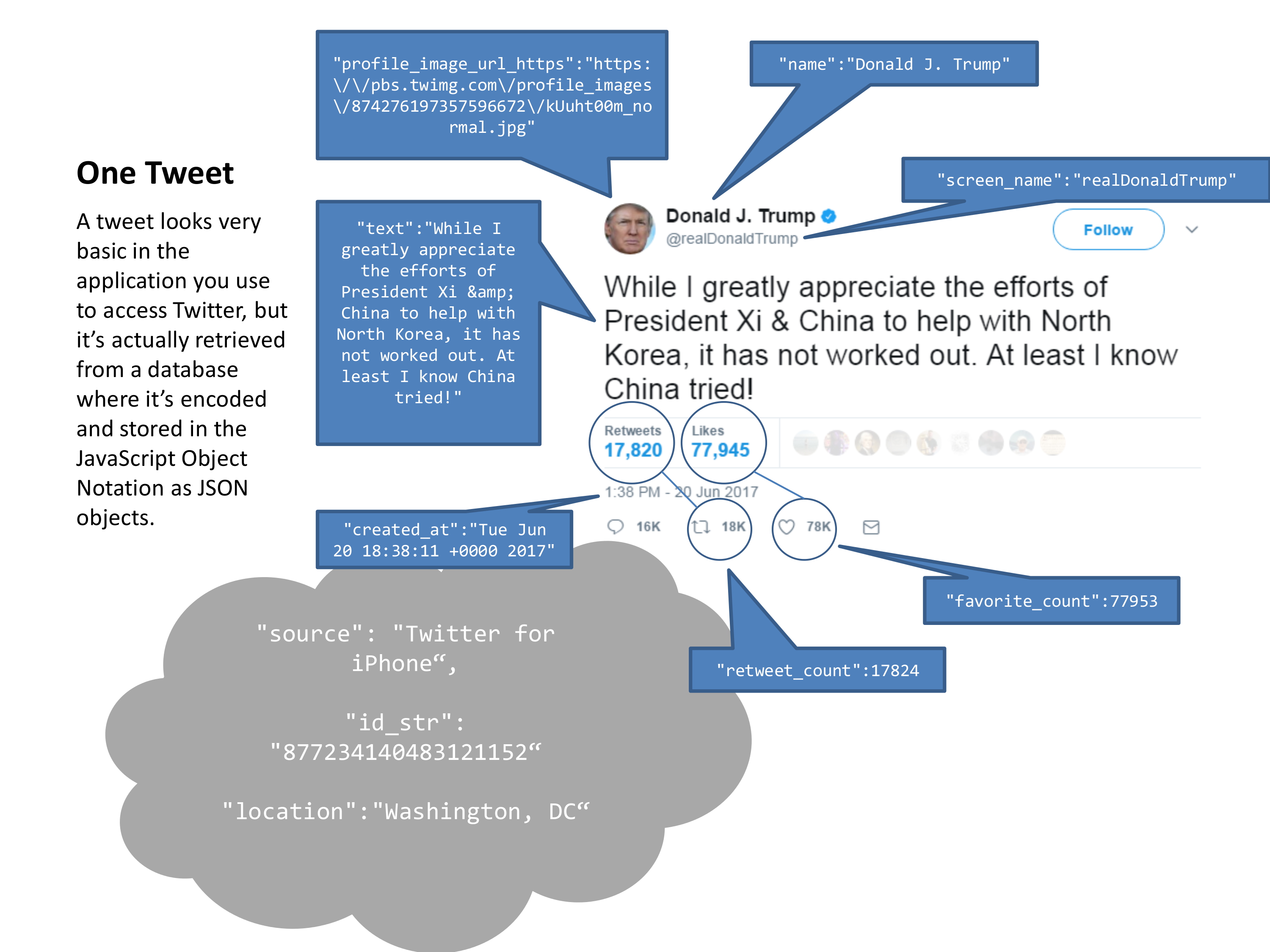 Slide showing different JSON components of a tweet for a talk I gave to high school kids on internet research.